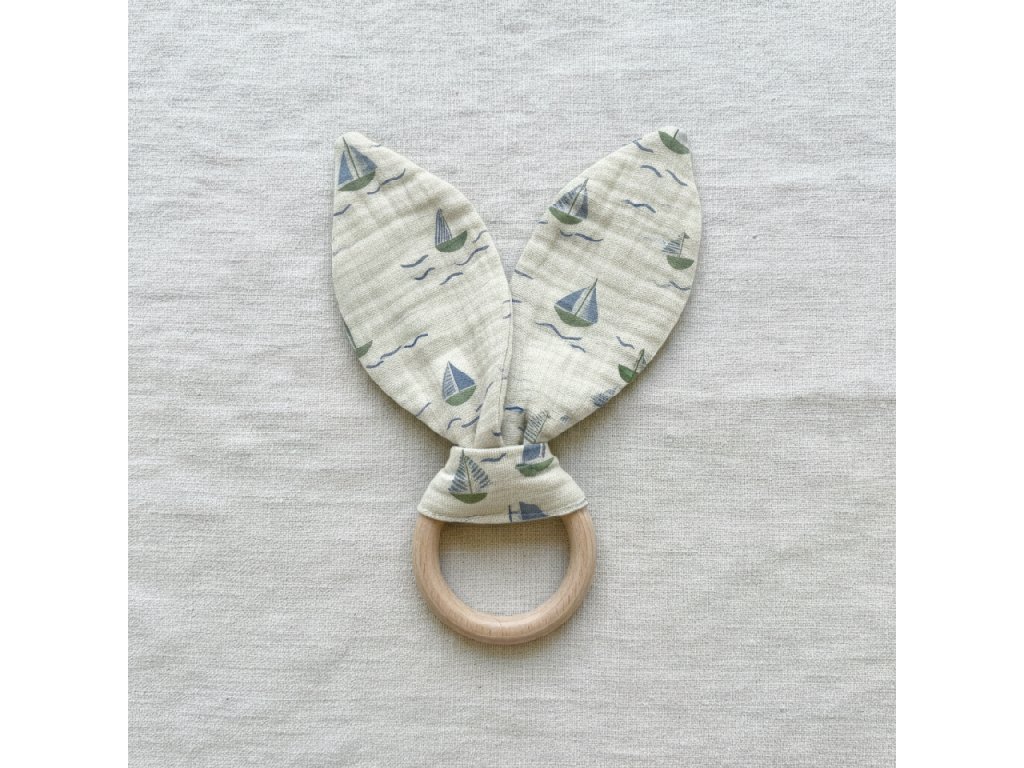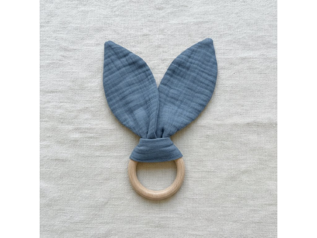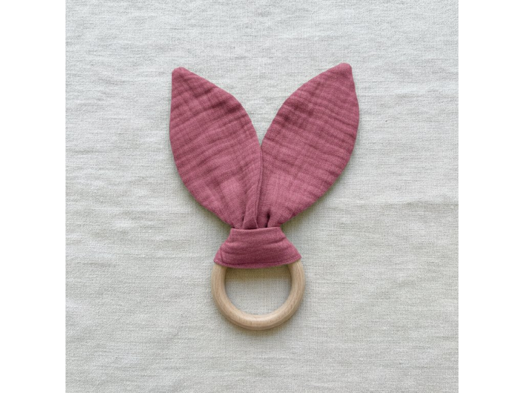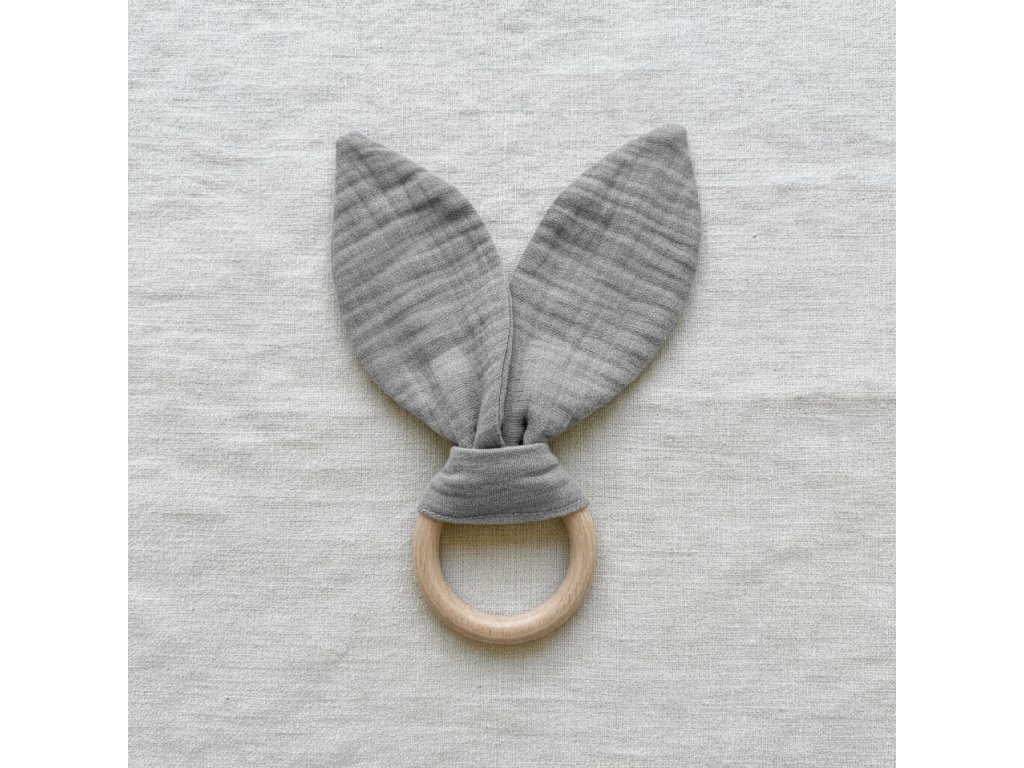 Naše kousátko pro miminka spojuje funkčnost a jemnost přírodních materiálů. Základ tvoří dřevěný kroužek z neošetřeného dřeva, který je příjemný na dotek a bezpečný ke kousání. Na něj je zauzlovaná látka z jemného mušelínu, která tvarem připomíná roztomilá zajíčí ouška – ideální pro malé ručky a zvídavá ústa.