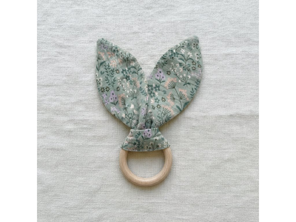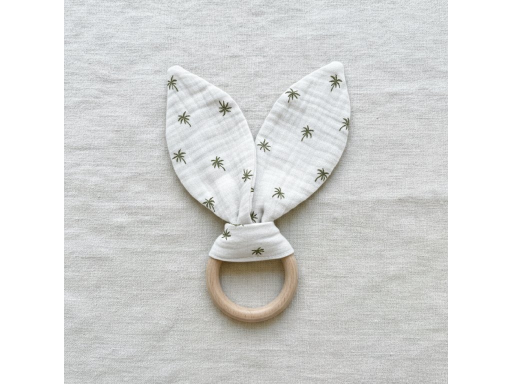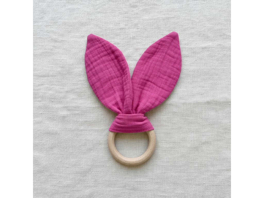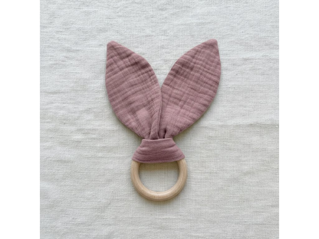 Naše kousátko pro miminka spojuje funkčnost a jemnost přírodních materiálů. Základ tvoří dřevěný kroužek z neošetřeného dřeva, který je příjemný na dotek a bezpečný ke kousání. Na něj je zauzlovaná látka z jemného mušelínu, která tvarem připomíná roztomilá zajíčí ouška – ideální pro malé ručky a zvídavá ústa.