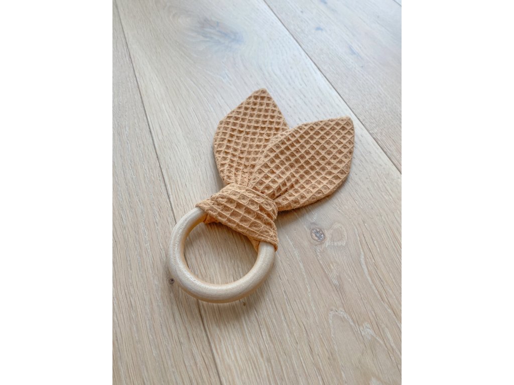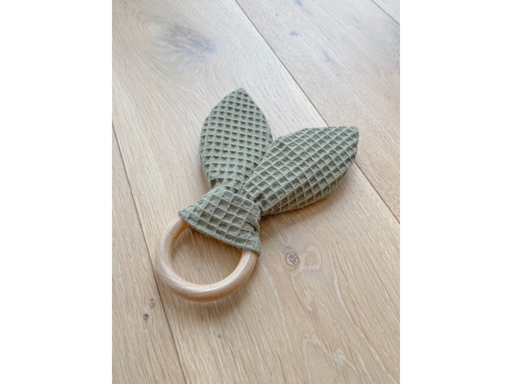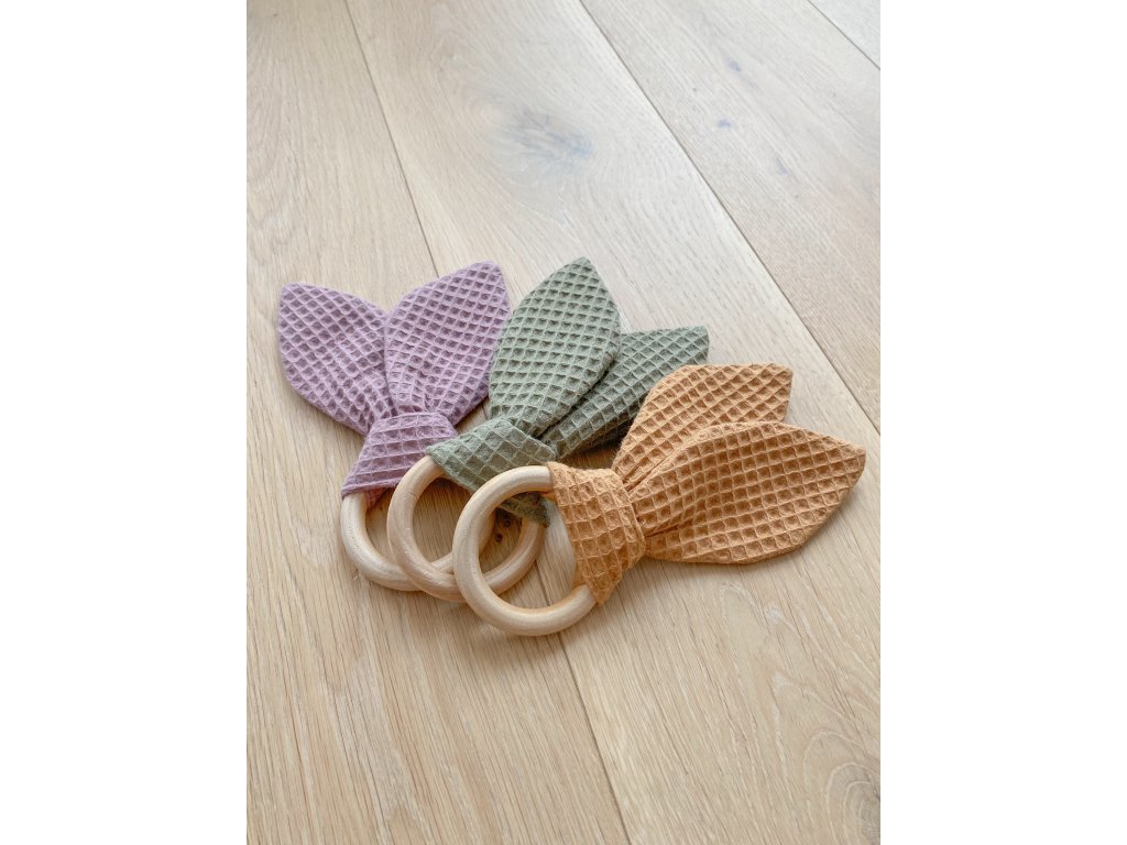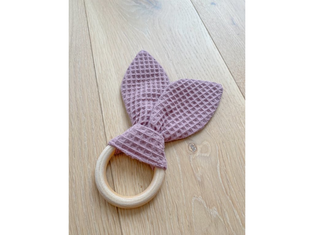 Naše kousátko pro miminka spojuje funkčnost a jemnost přírodních materiálů. Základ tvoří dřevěný kroužek z neošetřeného dřeva, který je příjemný na dotek a bezpečný ke kousání. Na něj je zauzlovaná látka z jemného vaflového pique, která tvarem připomíná roztomilá zajíčí ouška – ideální pro malé ručky a zvídavá ústa.