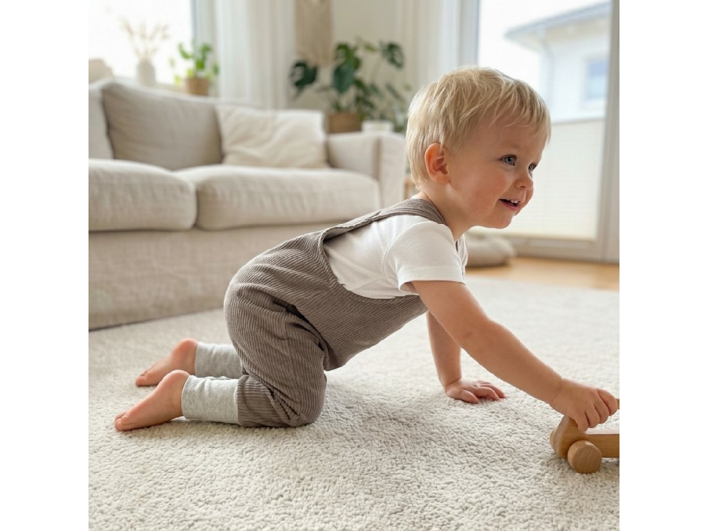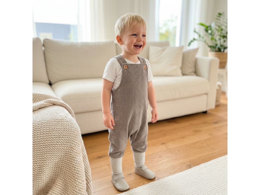 Měkký a prodyšný manšestr – přírodní materiál šetrný k dětské pokožce, ideální na celoroční nošení.