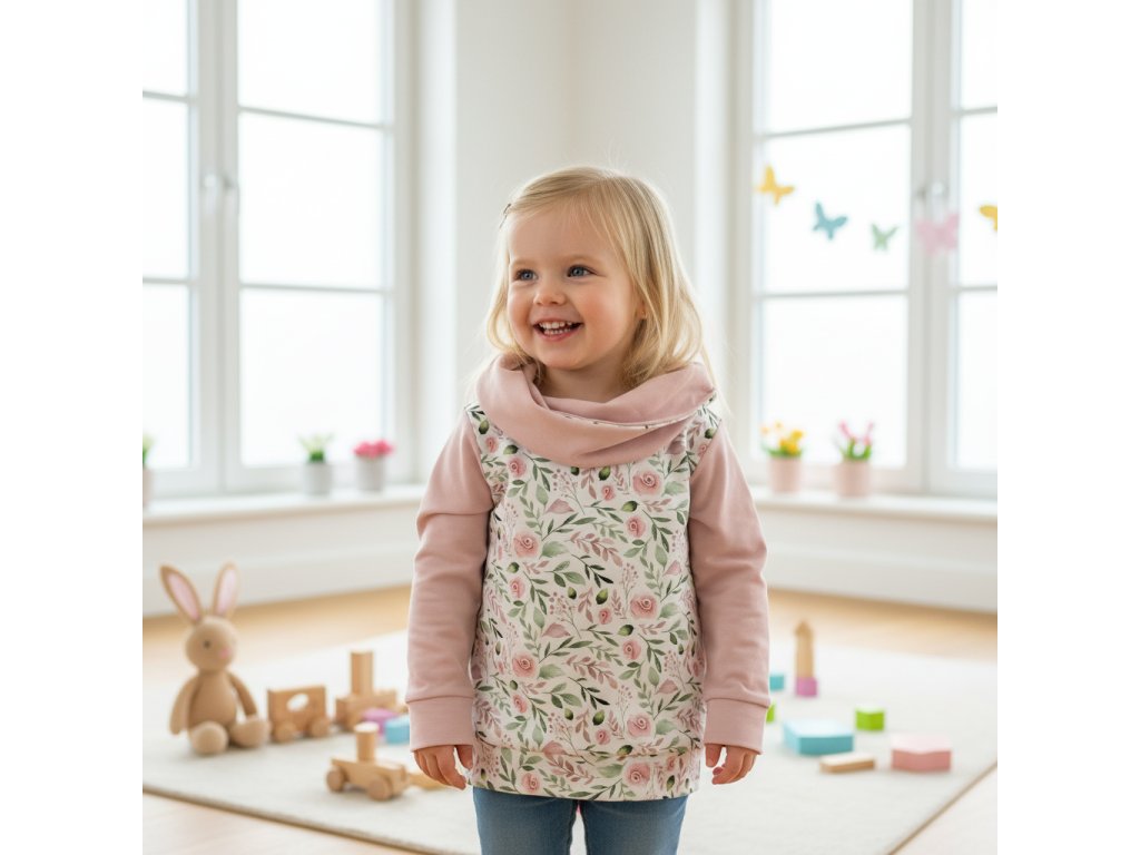 Mikina z velmi příjemné teplákoviny (French Terry) se vzorem květů. Vybrat si můžete ze tří střihů (zavinovací límec, zavinovací kapuce, kukla kapuce).