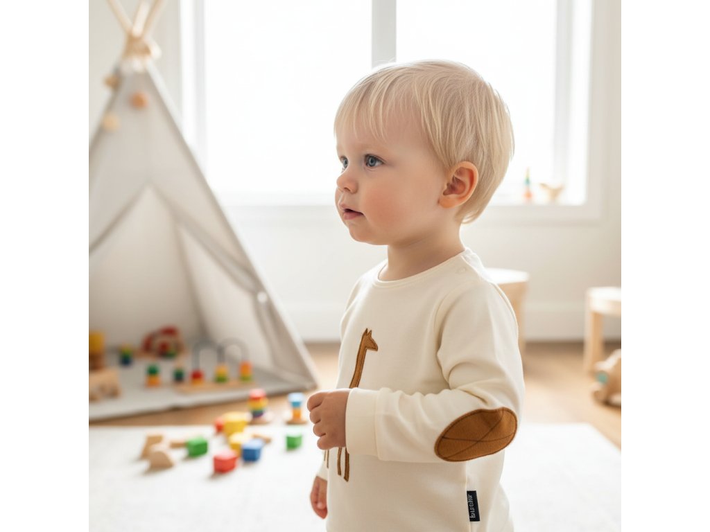 Mikina z velmi příjemné počesané teplákoviny v barvě ecru. Na přední straně je našita aplikace žirafi. Na loktech jsou také nášivky.