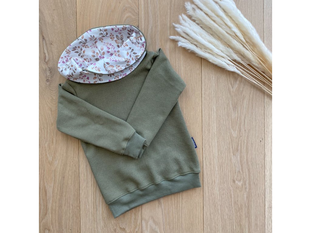 Mikina z velmi příjemného vaflového úpletu v olivové barvě. Vybrat si můžete ze tří střihů (zavinovací límec, zavinovací kapuce, kukla kapuce). Vnitřek límce nebo kapuce je podšitý příjemným úpletem se vzorem suchých větví.