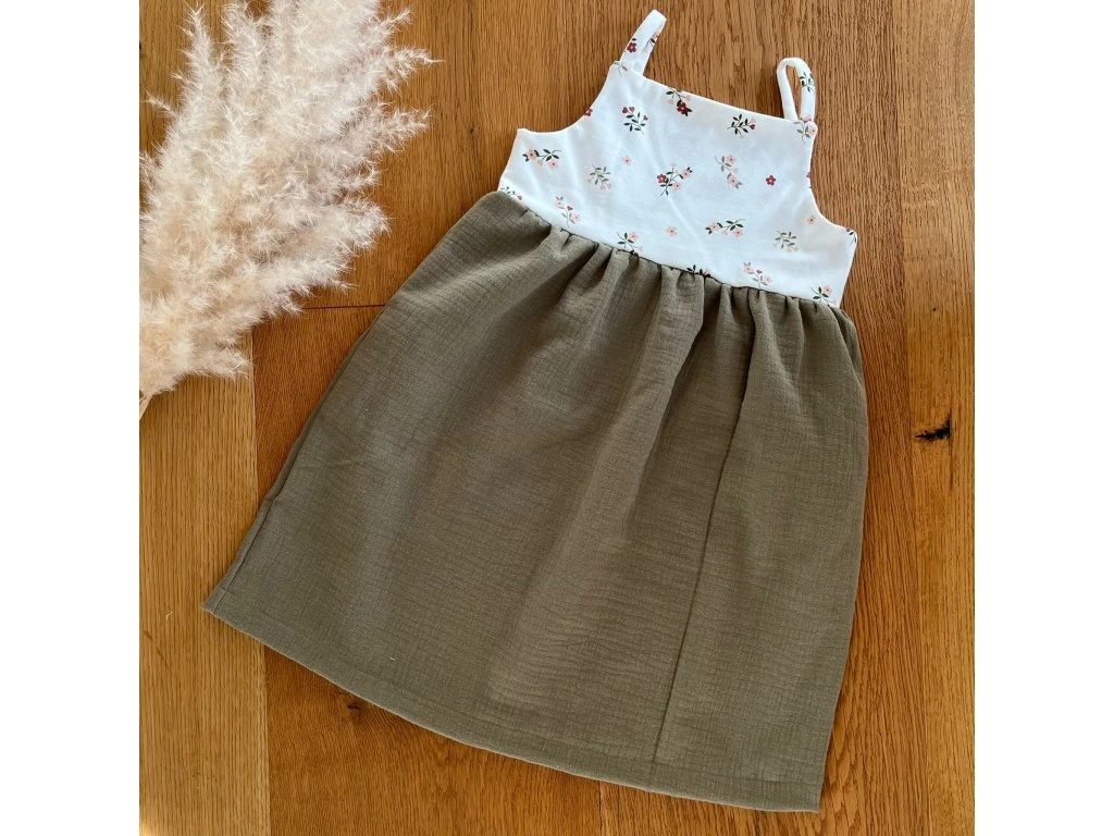Spodní část z lehkého mušelínu v olivové barvě dodává šatičkám přirozený, zemitý vzhled. Mušelín je ideální do teplých dní – je prodyšný a velmi příjemný na nošení.