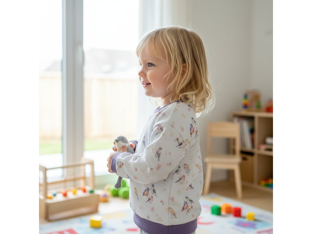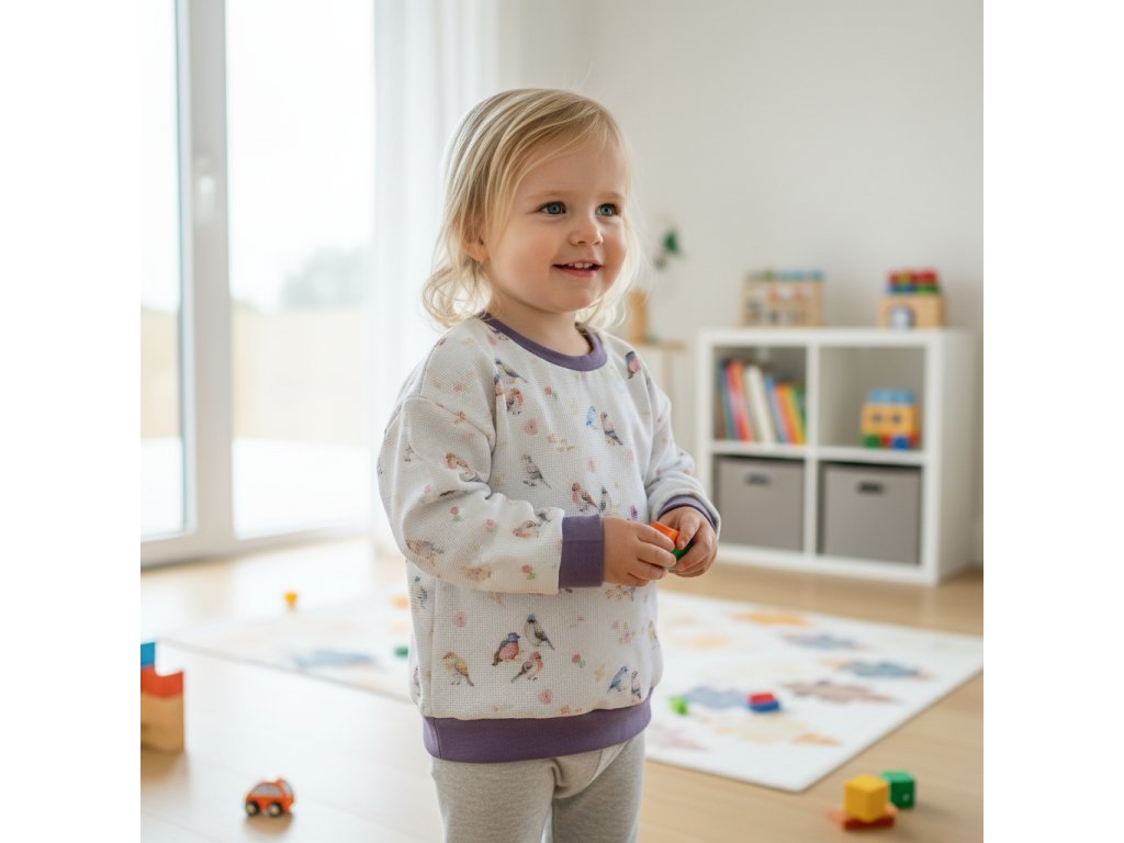 Měkká a lehká mikina z prodyšného vaflového úpletu s jemným motivem ptáčků. Volný oversized střih zajišťuje maximální pohodlí, volnost pohybu i prostor pro růst – ideální pro malé objevitelky na doma, do školky i ven.